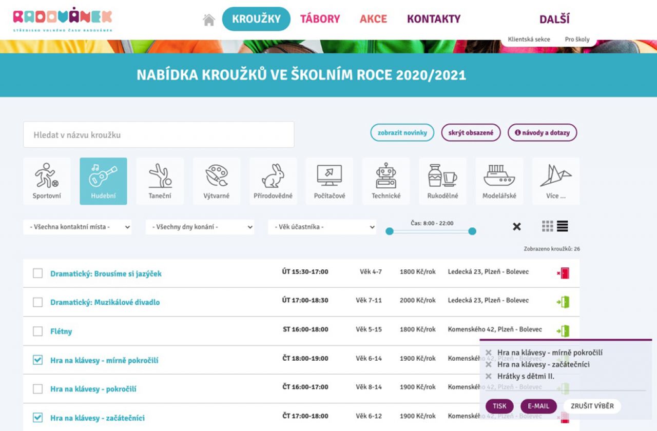 Naprogramování personalizovaného výběru ze seznamu kroužků do košíku s následným vytvořením jednoho přehledného PDF souboru. Toto programování jsme realizovali na námi v roce 2019 vytvořeném webu Střediska volného času RADOVÁNEK.