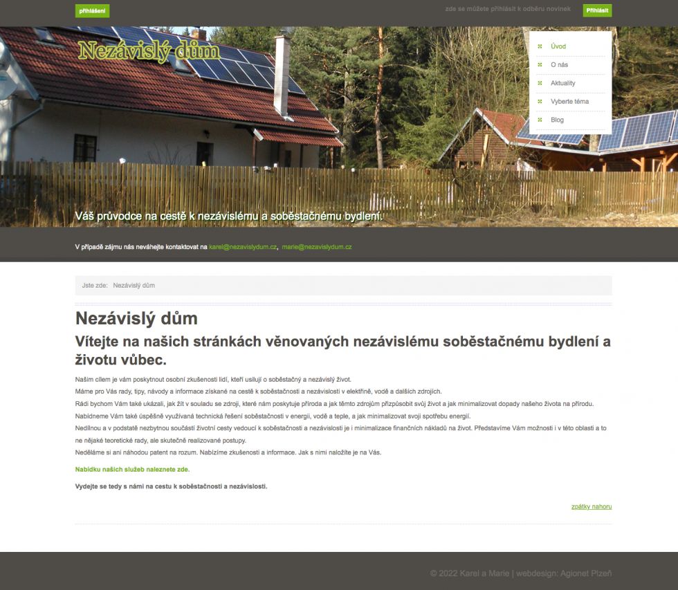 Zajímavý projekt našeho klienta, který se rozhodl, že opustí město a začne žít v přírodě. Svůj dům zařídil maximálně nezávisle (tvoří si zdroje vlastními silami, soláry, …) a nyní se o své zkušenosti dělí s ostatními.